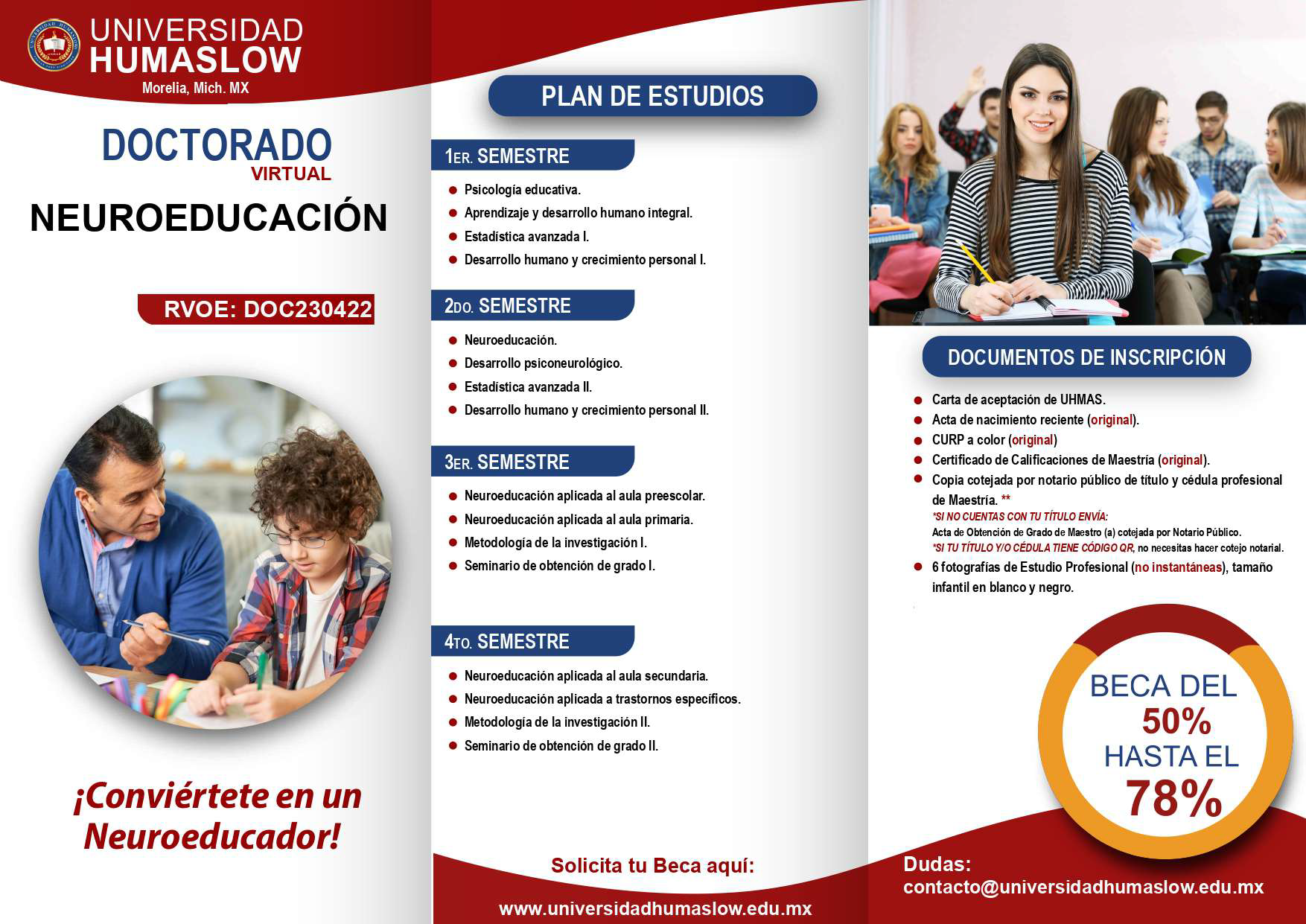 En este Doctorado se estudia el funcionamiento del cerebro y la intervención de procesos neurobiológicos y psicológicos en el aprendizaje; analizando el desarrollo del cerebro humano y su reacción ante los estímulos internos y externos que posteriormente se convierten en conocimientos.